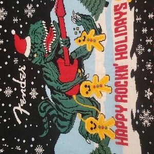 Fender® 2023 T-Rex Ugly Christmas Sweater Size Small. Festive Fender sweater with playful holiday design. Features a dinosaur and gingerbread men. Perfect for seasonal celebrations. Comes from smoke free home