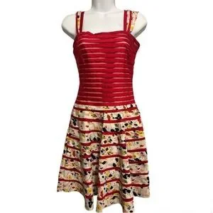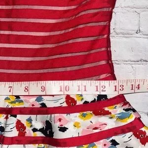 Chic and vibrant Diane von Furstenberg silk dress featuring a striking red bodice with sheer horizontal panels and a floral-striped skirt that creates a fun, feminine silhouette. Crafted from a luxurious silk and Lycra blend for a smooth, comfortable fit with a touch of stretch.