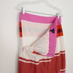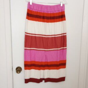 Ann Taylor Striped Linen-Blend Midi Skirt, size zipper, lined, rear slit, elastic at the rear waistband. Pretty, preppy, colorful stripes, great for work, office, summer casual wear.