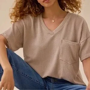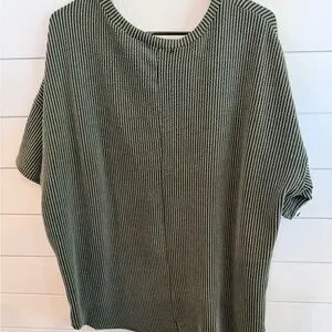 Chic green striped V-neck top. Features short sleeves and a comfortable fit. Last photo to show how it’s modeled. It’s a little longer in the back and makes for the perfect tucked into jeans look. Worn maybe one time.