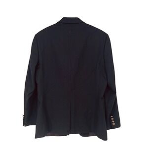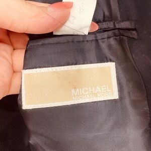 Michael Kors navy wool blend blazer jacket. This sophisticated jacket features a classic single-breasted design with a two-button closure and notched lapels. Two front flap pockets and a welt chest pocket offer functional detail, while the interior features a smooth lining for comfortable wear. The jacket is suitable for business casual settings, formal events, or elevating an everyday outfit.