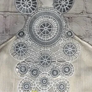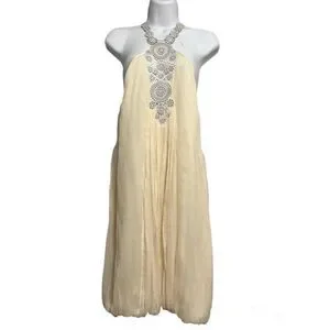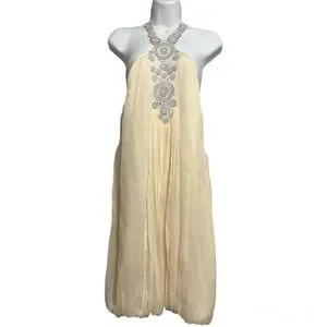 Absolutely breathtaking Catherine Malandrino silk halter dress in a soft cream tone. Crafted from 100% silk, this piece features exquisite beaded medallion embellishments along the neckline and a flowing pleated silhouette that drapes beautifully. The gathered hem adds a touch of volume and movement, making it perfect for weddings, resort evenings, or elegant summer events.