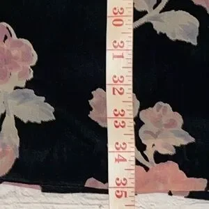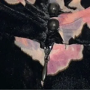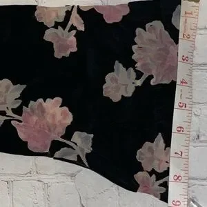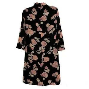Elegant black dress with a soft, plush velvet-like texture and beautiful blush-tone floral pattern. Features a keyhole neckline with a gentle mock collar and flowy sleeves for a romantic, effortless silhouette.