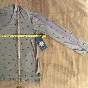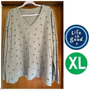 Life Is Good Dog Lovers Light gray V-neck shirt featuring playful black / dark charcoal gray dog prints. Super fun for shirt that is both cute and classy.