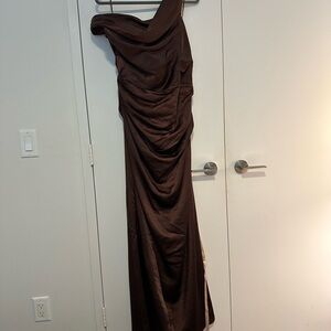 Brand new, never been worn with tags; this elegant brown one-shoulder dress is perfect for any occasion. Beautifully structured with a built-in corset that creates a flattering silhouette.