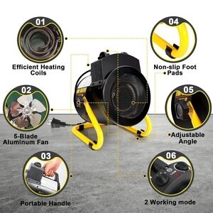 Compact fan heater with digital control. Features a black body and yellow stand.