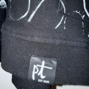Paper Temples art to wear brand graphic print black sweatshirt with side pockets, unique graphic sunglasses print in white. Cotton, size 3, M/L equivalent.