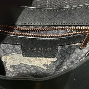 Elegant Ted Baker crossbody with rose gold accents. Features a sleek black design and chain strap. Perfect for any occasion.