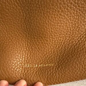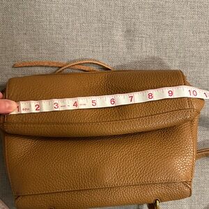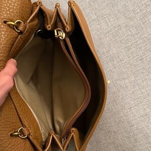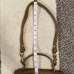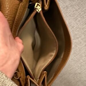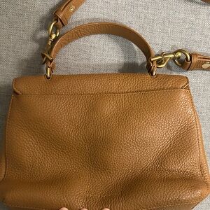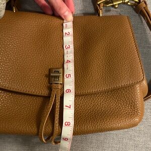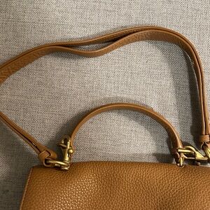 Chic tan leather satchel with gold-tone hardware. Features a top handle and adjustable strap. Perfect for everyday use.