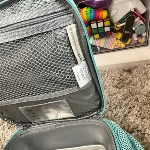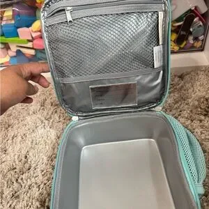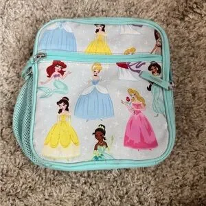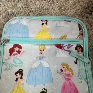 Charming lunch bag featuring Disney princesses. Light blue trim with colorful princess designs.