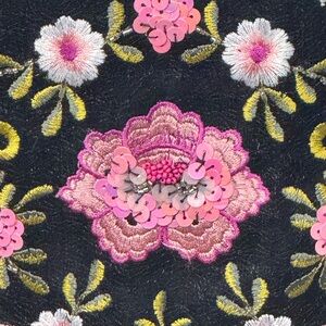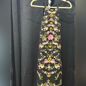 Chic mini dress by Alyce Paris. Black base with intricate pink and yellow floral embroidery. Ideal for stylish events. Pit to Pit 17 over all length is 33 NWOT