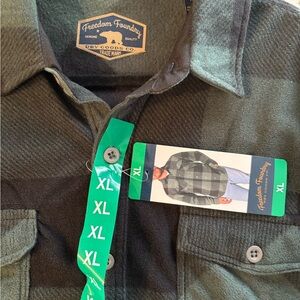Stylish green and black plaid button-up shirt. Features two chest pockets and button cuffs.
