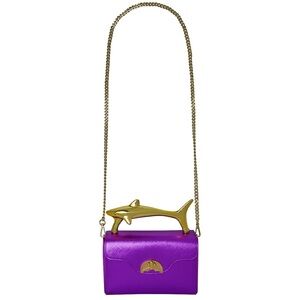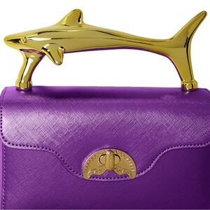 Shimmer and shine! Custom shark molded handle clutch with metallic purple fabric. Includes optional chain for crossbody wear and turn lock. Includes one interior pocket. HANDLE WITH CARE!