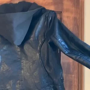 Chic black leather jacket by DOMA. Features a stylish hoodie that zips out to give a different look. Perfect for layering and adding edge to any outfit.