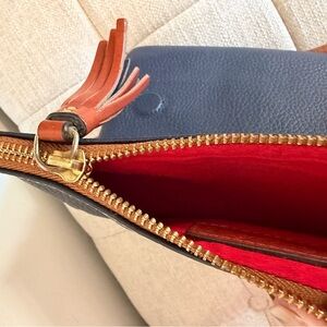 Gorgeous Dooney & Bourke genuine pebble leather crossbody in a rich navy blue with tan leather trim. Features a foldover magnetic closure, front zipper pocket with tassel pull, and bright red interior lining. Classic, durable, and the perfect hands-free everyday bag.