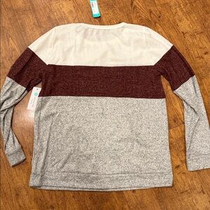 This three color block sweater from Pink Clover is just so soft!!! It’s a brushed knit and you will just want to luxuriate in it all day! Crew neck and long sleeve and features ivory, burgundy, and gray color blocks. New with tags from a smoke free seller and home!