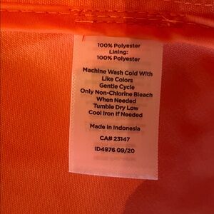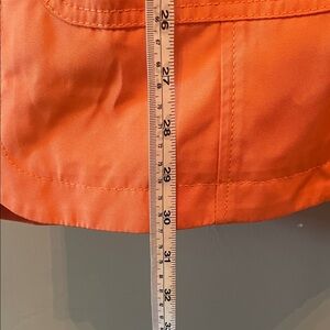 Vibrant orange rain coat by Talbots. Includes a hood and front pockets. Also features a zippered left side small pocket. Features a drawstring waist. Buttons on the bottom sides for extra room. Length of sleeves and overall length shown in pictures. Perfect for a windy or rainy day out.