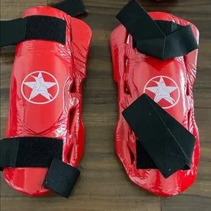 • 2 red shin guards with adjustable black Velcro straps. Each piece features durable padding, a glossy red exterior, and a white star emblem on the front. The guards secure comfortably with black elastic and Velcro straps for a stable fit during training.