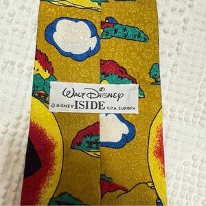 Vibrant, vintage Walt Disney 101 Dalmatians tie, featuring Pongo & Perdita on a rich, gold-tone scenic print. This collectible necktie is 100% silk, expertly crafted in Italy by the licensee Iside S.p.A. Europa. It boasts bright colors and a fun novelty design, and is in excellent vintage condition.