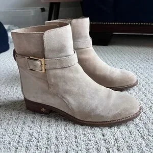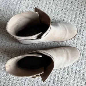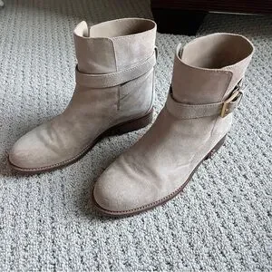 Elegant suede booties with a chic buckle detail. Perfect for versatile styling. Tan suede and real leather. Worn 3x. Excellent quality boots perfect to dress up or down. Size 7.5.