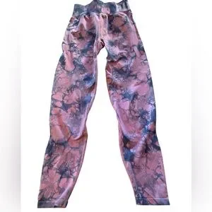 These trendy tie-dye leggings are perfect for your wardrobe. Featuring a blend of pink and blue, they offer both comfort and style for everyday wear. In very good pre owned condition. They have a pocket in the inside back waist as pictured
