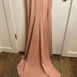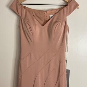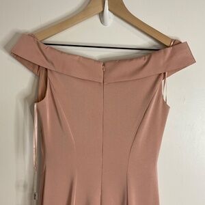 blush gown, off shoulder formal dress, bridesmaid dress, evening gown, prom dress, maxi gown, structured bodice dress, slit gown, formal wear, size XS dress, new with tags