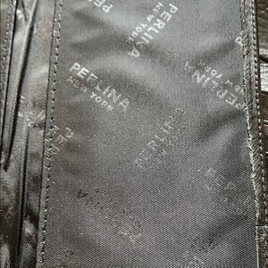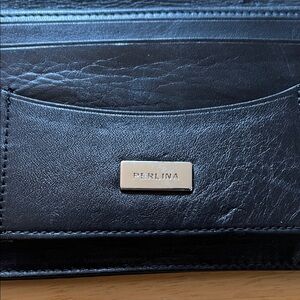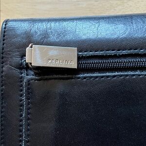 Beautiful preowned vintage Perlina Signature Leather Wallet in Classic Black Smooth Leather with silver tone metal hardware. Measures 7 1/4”x 4”x 3/4” when closed. Features 1 exterior zipped pocket with Logo zipper pull, adjustable snap closure , 1 business card/ID slot, 2 long pockets for cash, 1 Pen/Stylus holder slot, 6 card slots, plus removable check book holder with window ID slot and 3 additional card slots. Perfect if all you want to bring is your wallet, but easily fits most purses. Bonus- if you remove the checkbook holder the space fits a smartphone approximation 6” x3” (my iPhone 13 fits) Some visible scratches/scuffs from being inside a purse with other items that may be repairable. See all photos.