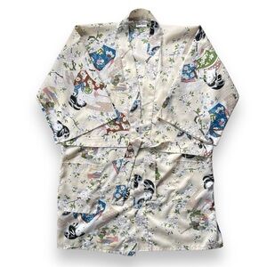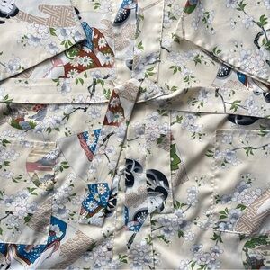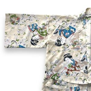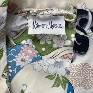 Kimono style layering piece in traditional Japanese print. Vintage Neiman Marcus brand. No legible information on the tag. Not silk - probably polyester blend. Comes with a belt/tie but there are no belt loops. 3/4 sleeves.