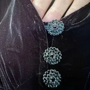 Button Front: A full row of black metal and gem buttons runs down the front
