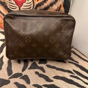 Sophisticated unisex Louis Vuitton toiletry bag. Iconic monogram pattern. Small signs of use inside see photos of very minor stains. Zippy. Item is as pictured and very nice .