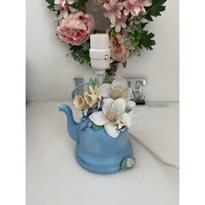 So Charming !!!! Vintage Marjolein Bastin Blue Tea Pot Table Lamp Bumble Bees Flowers Daffodils . This beautiful table lamp is sure to brighten up any room with its delightful design. Featuring lovely flowers and bumble bees, this Marjolein Bastin lamp adds a touch of whimsy to your decor. The lamp is powered by electricity and functions perfectly, providing a warm and cozy ambiance to your space. The lamp's unique blue tea pot shape is a true delight that will enchant anyone who sees it. It makes a great addition to any collection of lamps, lighting, and collectibles. Get this charming piece today and add some cheer to your home or office! NO SHADE. Measurements: 10.5" x 6.5" x 6.5". Light Bulb not Included.