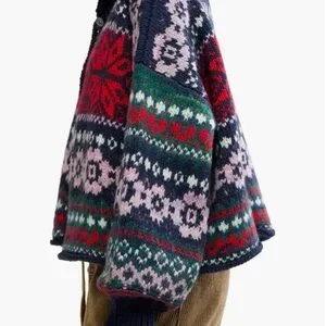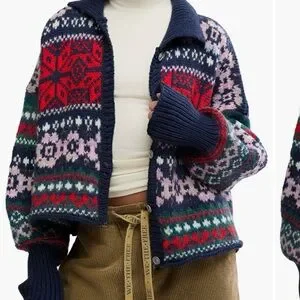 A festive Fair Isle pattern makes a bright bold statement on a cozy cardigan that’s a must have for chilly weather.