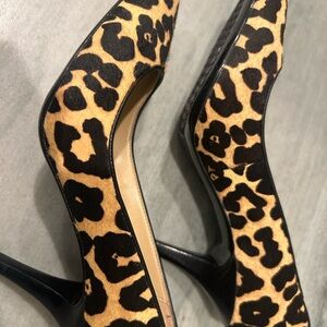 Elevate your look with these striking leopard heels. Perfect for a bold statement. Very lightly worn; pony hair detailing.