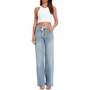 Womens High Waist Wide Leg Denim Jeans Drawstring Casual Cotton Polyester