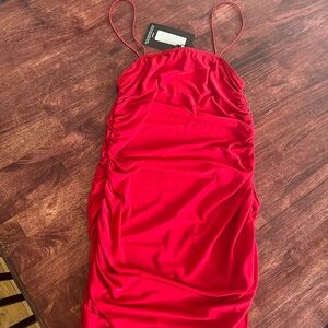 Chic red mini dress with ruched detailing. Perfect for a bold look.