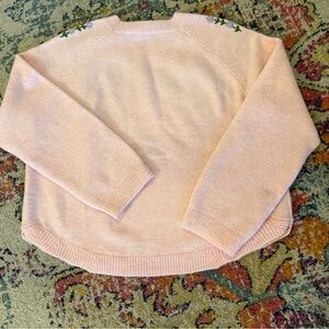 Stay cozy and stylish with this pink floral embroidered sweater. Perfect for adding a touch of elegance to your wardrobe. Curved hem and gorgeous details.