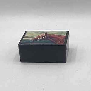The vintage KY Derby Museum Trinket Box Secretariat 1973 Winner is a black plastic trinket box featuring a rectangular shape and measuring 3.25x1.25x2.75 inches. It pays homage to the iconic horse racing legend Secretariat, who won the 1973 Kentucky Derby. The glossy finish adds a touch of Americana style to this collectible piece, perfect for adults who appreciate horse racing history and 1970s nostalgia. This unique and stylish trinket box that celebrates both the sport of horse racing and the era of the 1970s.