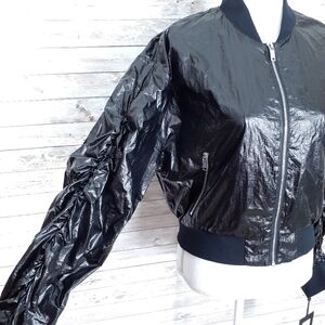This is a new womens nylon jacket with ruched sleeves.