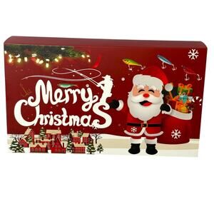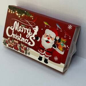 New holiday fishing lure gift set in a festive Merry Christmas box. Includes a mixed assortment of soft baits, hard baits, and a metal spoon lure, all stored in a clear divided tackle case. Great gift for anglers and perfect for freshwater fishing.