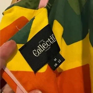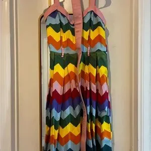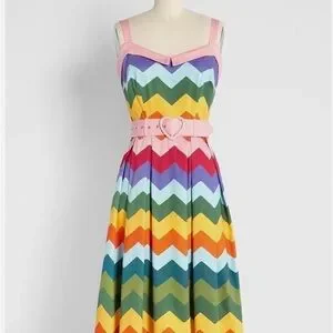 Chic midi dress with a vibrant chevron pattern. Features a heart-shaped belt and playful colors. Gently used, has pockets and includes belt.