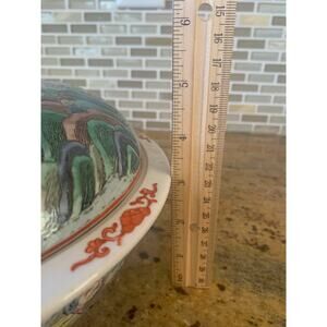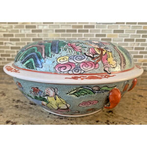 Beautiful vintage Chinese porcelain lidded serving bowl featuring a detailed hand-painted scene of children playing among colorful clouds. The piece showcases rich colors and intricate patterns, enhanced by a classic crackle glaze and elegant red handles. A stunning decorative or functional addition to any Asian-inspired or eclectic home décor.