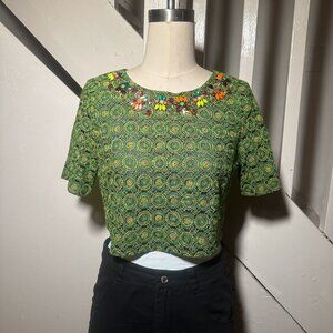 Stunning statement piece from Topshop. This green lace crop top features an intricate circular embroidered pattern and a jeweled neckline with bold, multicolor stones. Short sleeves, slightly boxy fit, and a back keyhole button closure. Perfect for parties, festivals, or dressing up a simple pair of jeans.