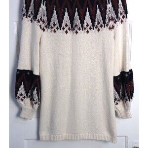 Free People Cream Brown Cotton Wool Mohair Blend Designer Scotland Fair Isle Nordic Icelandic Southwestern Aztec Boho Ski Fall Winter Warm Cozy Mock Neck Knee Length Sweater Dress with Bishop Sleeves & Ribbed Hem