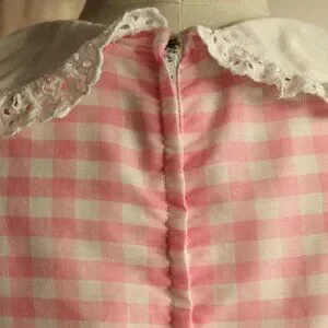 Darling vintage 1960s 1970s maxi dress in pink and white gingham with a big white lace trimmed collar. Shirred top, puffy sleeves and a tie at the waist. Metal zipper down the back. Label reads: no designer label but there is a care tag. Probably a large to extra large but do see measurements below. Looks and feels like a cotton blend maybe.