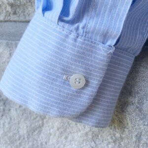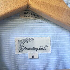 Blue and white pinstripe, long sleeve, button down top. Has a peter pan -esq collar, and a pleated tuxedo front. From the vintage 90s brand 'Something else'. In excellent, nearly-new condition! Only flaw is that one of the sleeve cuff buttons is a replacement that doesn't match it a circle, all the other buttons are squares), but its barely noticeable (see final pic). 100% Cotton. Size 6.