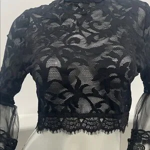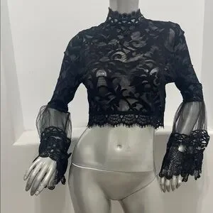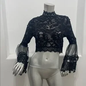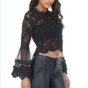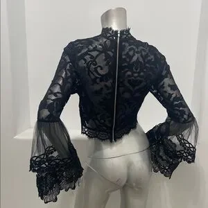 Elegant black lace blouse. Features intricate lace design. Flared sleeves add style.size large to 18 inches and stretch length 16 inches