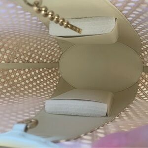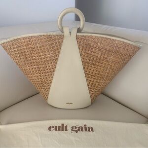 Stylish woven tote with a unique fan shape. Features beige leather accents. Perfect for casual outings.