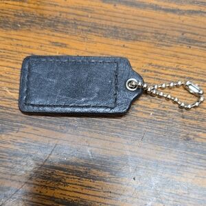 Sleek black leather key holder by Coach. Features durable chain and embossed logo.