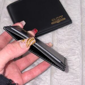 Sleek card holder with gold logo. Perfect for organizing cards in style. Matching folding wallet available