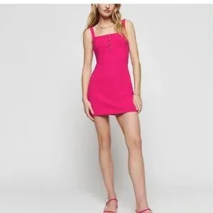 Chic and vibrant pink sleeveless mini dress perfect for any occasion. Features a stylish button detail on the front. Ideal for a night out or a casual day.